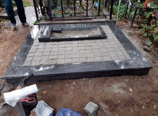 Когда подготовительные работы на территории могилы были завершены, мы принялись за укладку брусчатки на пескобетон, сама плитка была уложена вровень с облицованным гранитными плитами цоколем. Параллельно с этим мы подготовили основание для последующей установки надгробья.